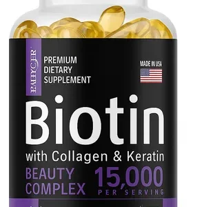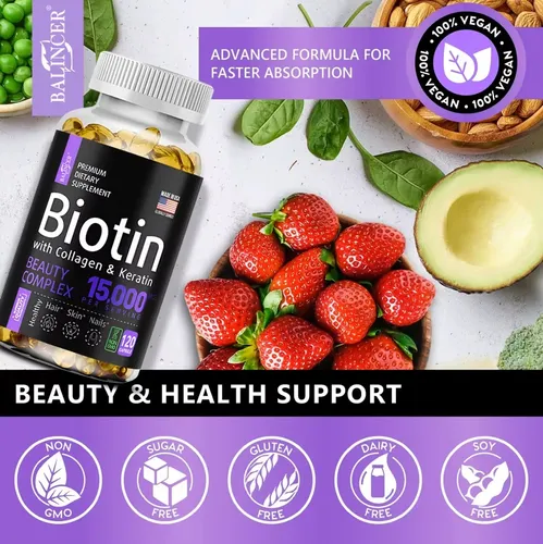 Biotina (15.000 mcg por porción) con Colágeno y Queratina. Balincer (120 softgels)