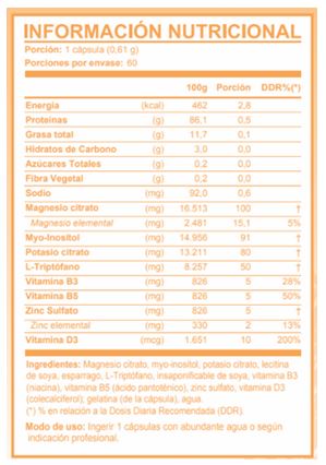 Ingredientes: Magnesio citrato (100 mg), Myo-inositol (91 mg), Potasio citrato (80 mg), L-triptófano (50 mg), Vitamina B3 (5 mg), Vitamina B5 (5 mg), Zinc sulfato (5 mg),